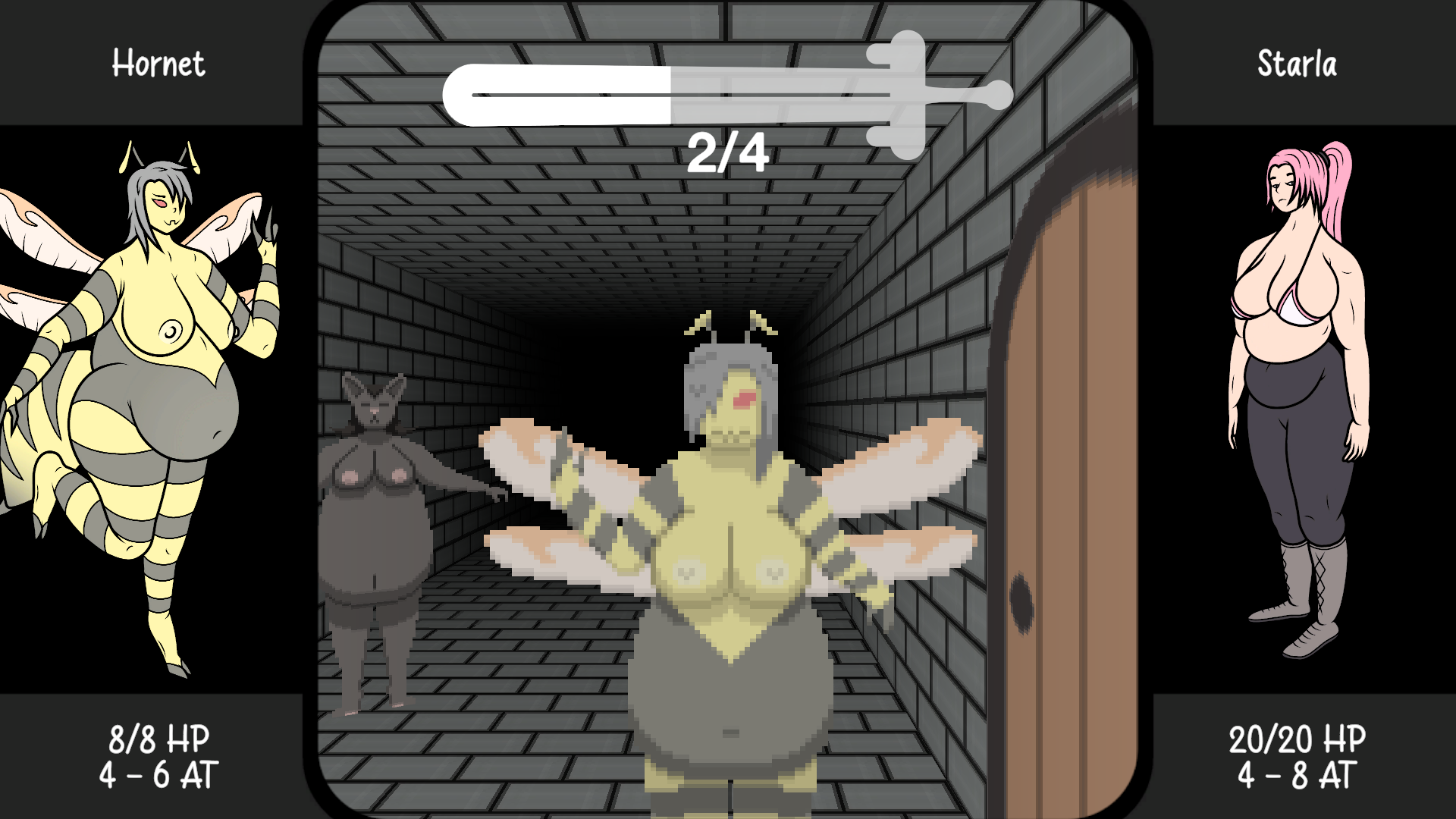 Explore procedurally generated dungeons, fight monster girls, interact with your surroundings, collect items, gain weight, and make another girl gain weight!